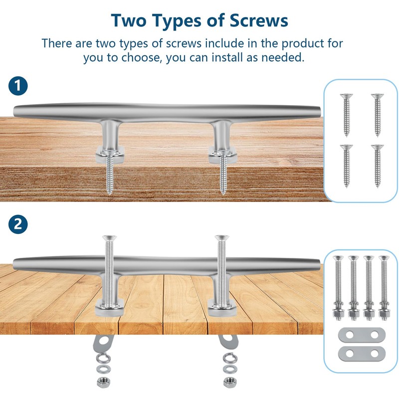 - 【BOAT CLEATS WITH BACK PLATE】: We provide two sets of boating accessories for installation, each set has a corresponding size of 316 stainless steel 4 x self-tapping threads, 4 x boat cleat bolts and 2 x upgraded boat cleat with backing plate accessories, so that you can have boat dock cleat in various places effortless to use, especially in the great outdoors, sturdy and hard-wearing, it stands up to the harsh marine environment.