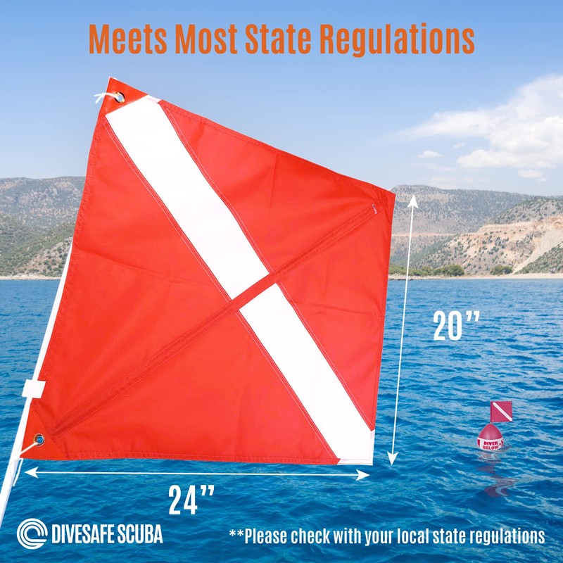 - State Regulation Legal - While you should always check with your state regulations for boat safety, our diver down flag is 20" x 24" which meets most state regulations.