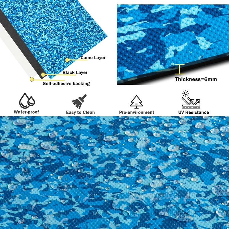 - Easy to Clean: The self-adhesive camo boat decking sheet is stain-resistant and easy to maintain, you can easily wipe dirt on it. EVA boat flooring can be washed with a vacuum cleaner or be pressure-washed