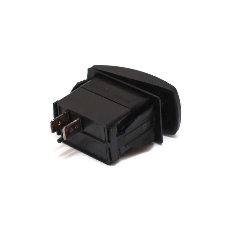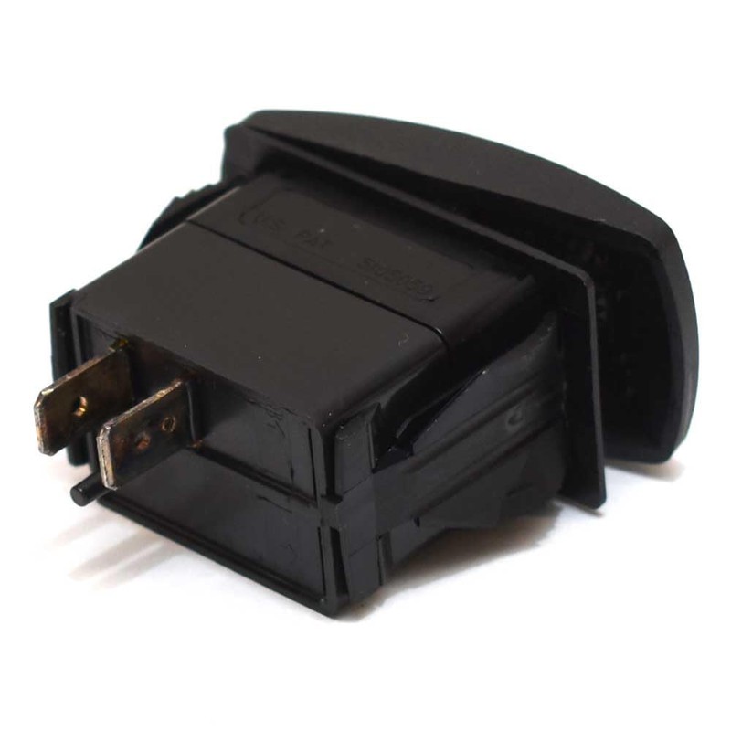 This momentary ON/OFF non-illuminated rocker switch is constructed out of black marine grade plastic. It measures approximately 2" H x 1" W x 2" D overall and requires an approximate 1 3/4" H x 3/4" W cutout. It has (2) male spades and a rating of 12V / 20A.