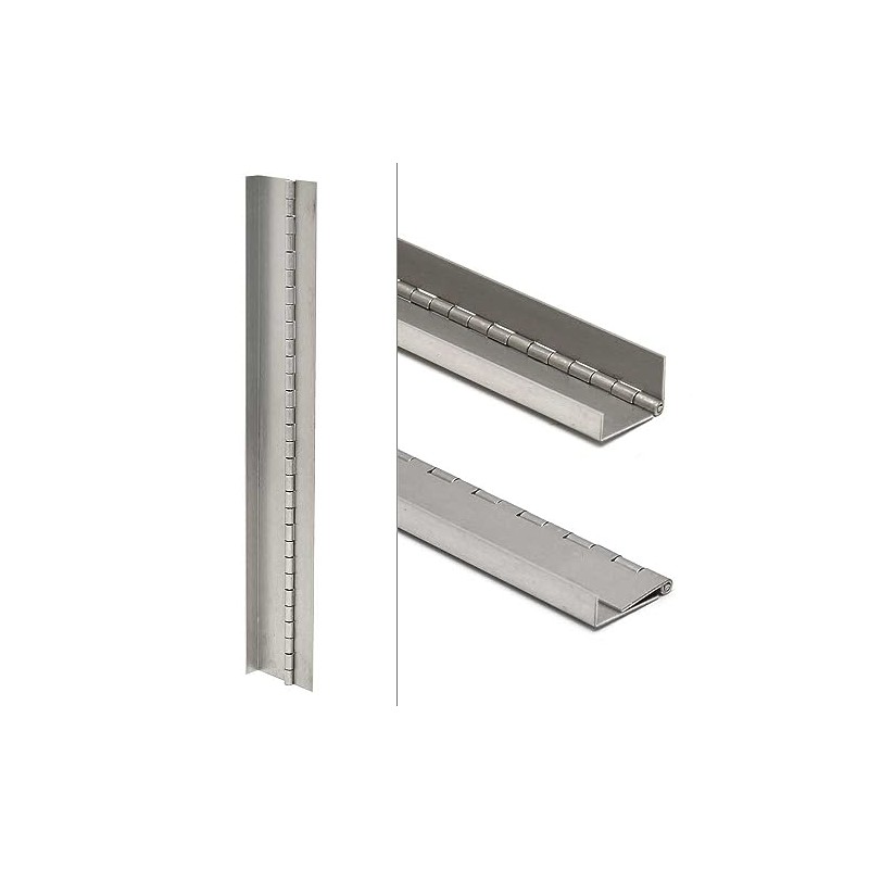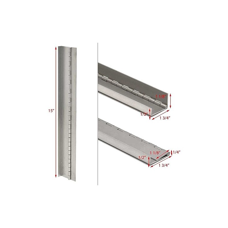 This hinge is constructed out of 14 gauge aluminum, and measures approximately 15" L x 2 3/8" W overall (when unfolded) and 15" L x 1 3/4" W overall (when folded).