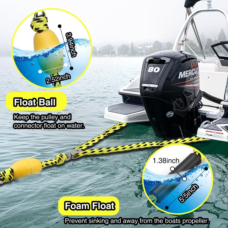 - SELF-CENTRING PULLEY DESIGN - 360 Degree rotation stainless steel pulley keeps rope and tube centered and balanced at all times, provide the optimum pull for extremely smooth turns while never getting caught. And 3.94 X 2.52inch large float ball ensures the pulley and connector float on water, so that away from the boats propeller.