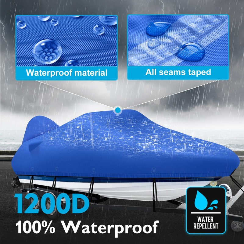 - 【Quality Weather Resistant Material】BOATPRO rugged build boat cover is crafted with 1200x1200 Denier marine grade polyester fabric, it will NOT tear and crack in the case of long-term high temperature and rain soaking. Extra two-layer reinforced bow & stern for better force-bearing performance. Double-stitched interlock seams with thread for enhanced durability.