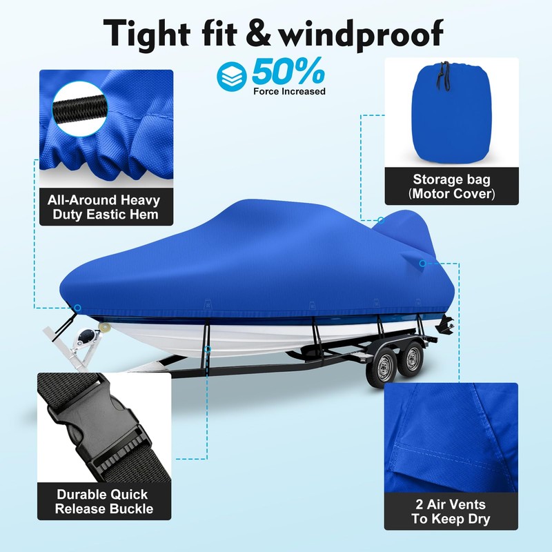 - 【Windproof Buckle Straps & Air Vents】The windproof buckle straps are Long enough to reach the trailer easily. We also added two straps to the stern area to make the entire cover hold together perfectly. The detachable design makes the strap replaceable if broken, No need to replace the entire cover. Elastic thicken 6mm cord around the bottom of the cover offers a snug fit. The two rear vents leave the heat out and allow the cover to breathe, reduce wind stress, and stay dry underneath.