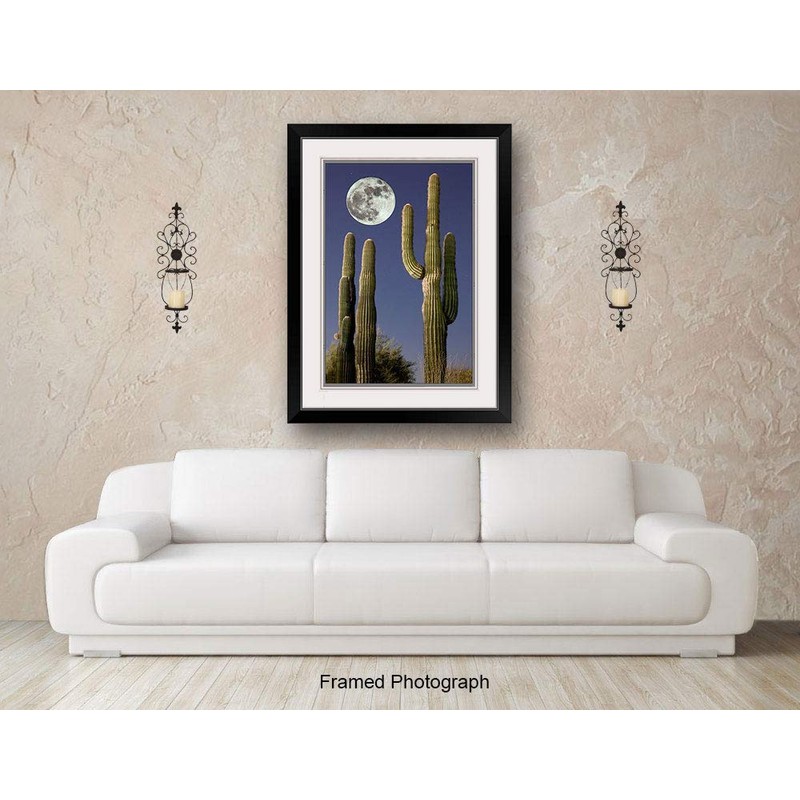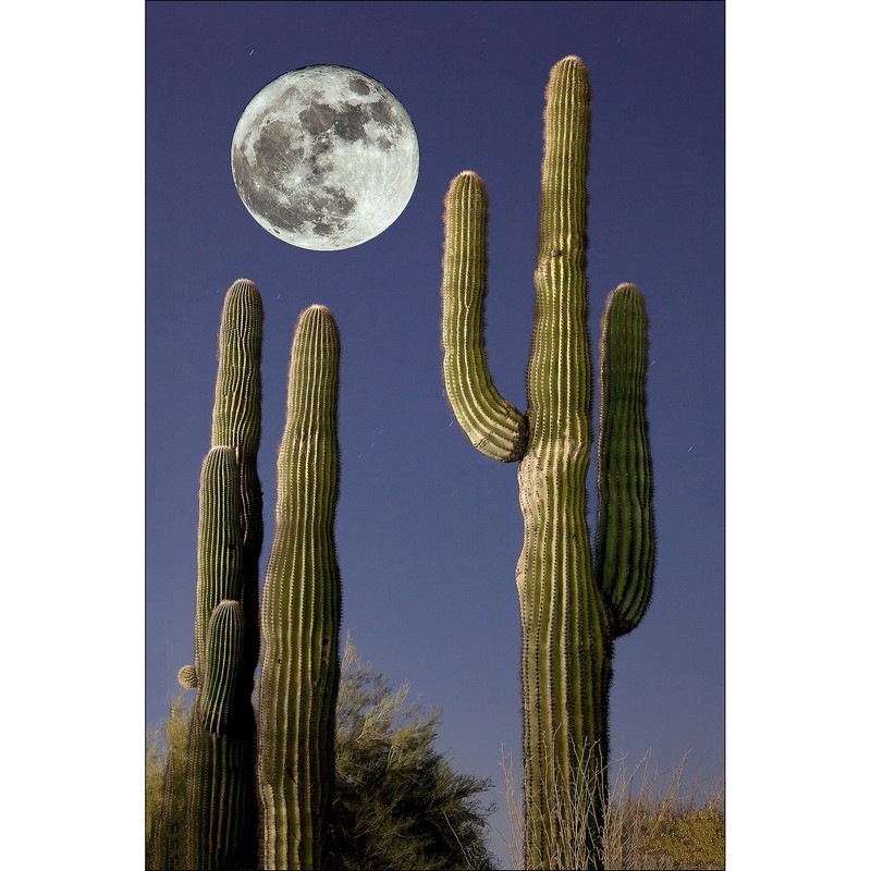 Bob Estrin Handmade Wall Art Decor Photograph of Large Full Moon over Saguaro Cactus in Desert Night Time Landscape