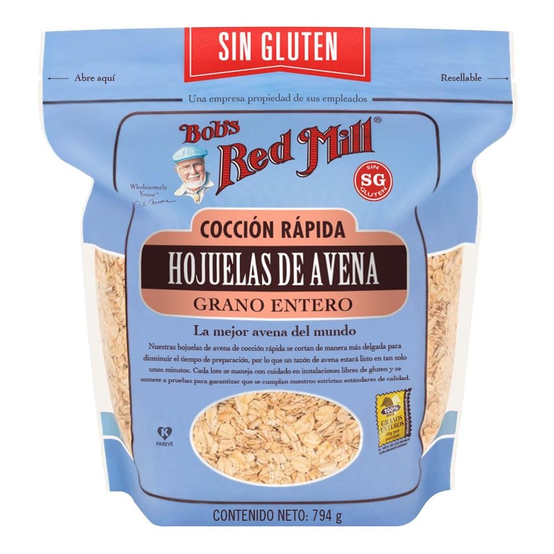 - Avena sin gluten rolada regular de rápida cocción, elaborado con granos enteros