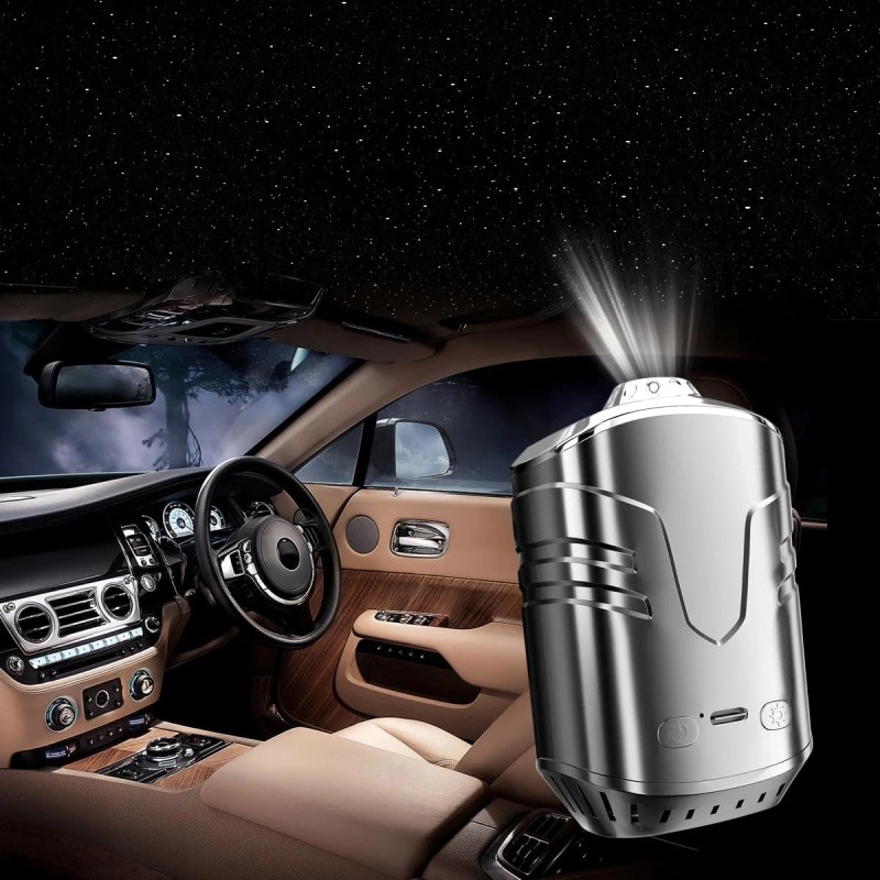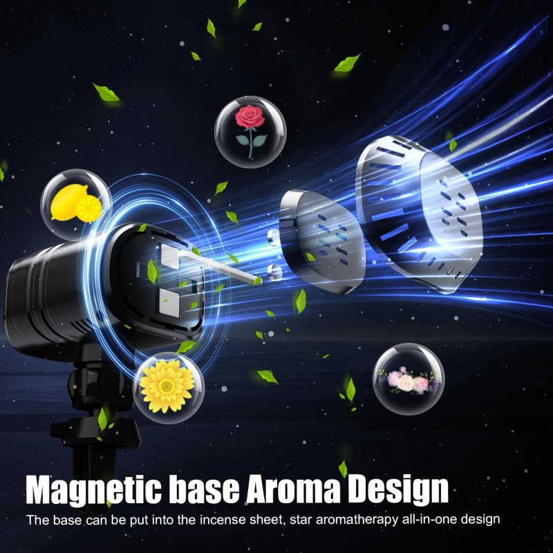 【2-IN-1 Aroma Diffuser & Projector】:This multifunctional device is not only a star projector, but also can be used as a car diffuser. It has 6 interchangeable scents, allowing you to freshen up your car's atmosphere with your favorite scent at any time