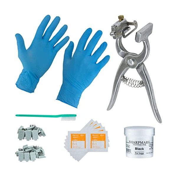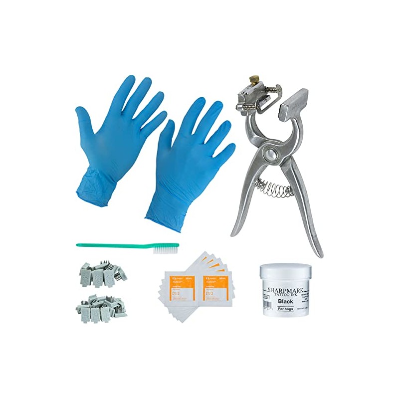 BOCCS Tattoo Kit Standard with 3/4In Digits and Numbers, Tattoo Pliers, Nitrile Gloves, and Ink for Identification of Sheep, Pigs, Goats, Cattle Livestock (0-9 & A-Z, Black)