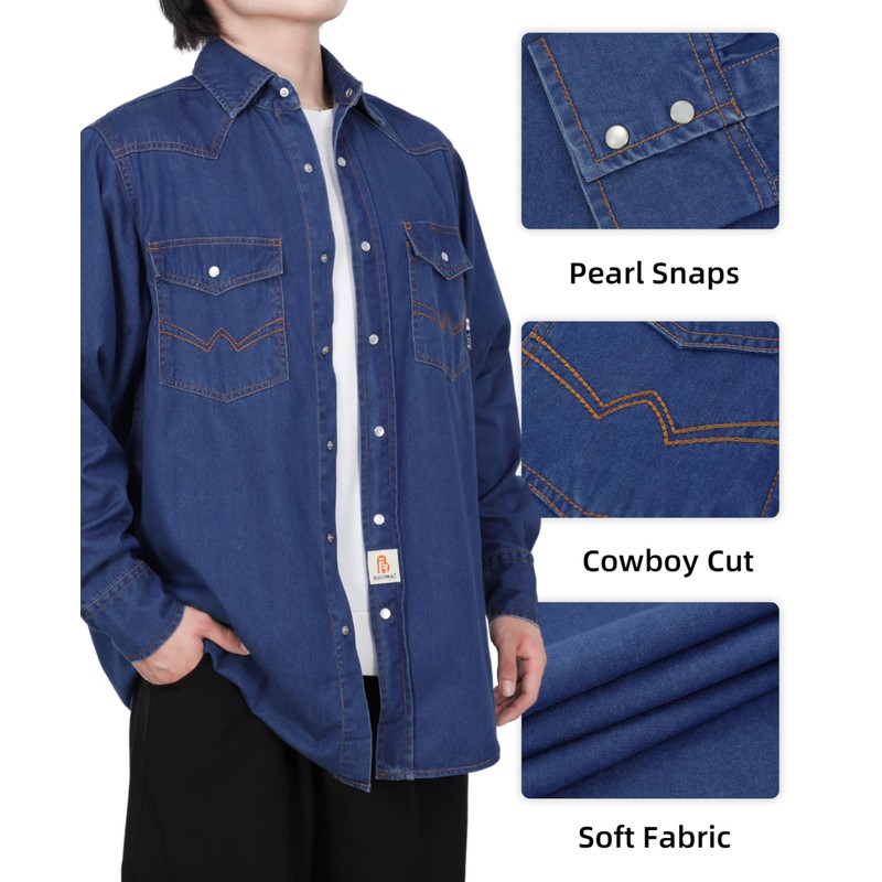 BOCOMAL FR Shirts Washed Denim EX Soft Lightweight Smooth Fit Pearl Snaps Dow...