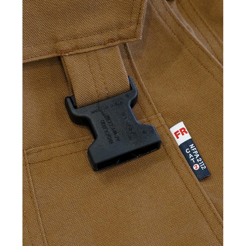 - FR MATRIALS:10oz 100% cotton durable duck canvas,water repellent stain resistant finish.US made FR adjustable buckles.Fabric Flame resistant treated,FR aramid threads,FR zipper front.Eyecatch FR tag,double front knee,buttom design for knee pad insertion.