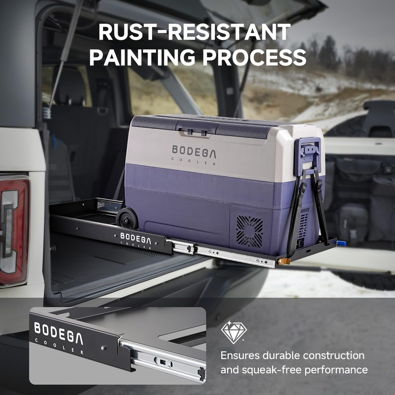 - 【INNOVATIVE】BODEGACOOLER Car Fridge Slides Suits most Portable Vehicle Fridge & Ice Cooler on the market. you could easily reach your drinks & food from your Fridge and Coolers by its full-extension smooth slides.