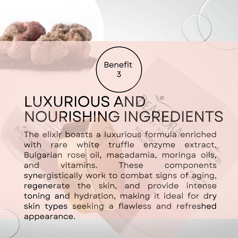 - Anti-ageing skin: enriched with rare white truffle extract, the elixir effectively fights fine lines on the skin and helps to reduce them.