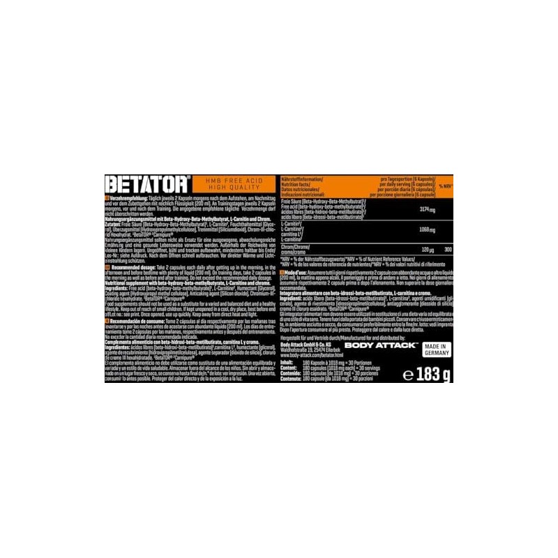 Body Attack Betator Liquid Direct - 180 Caps - HMB (Betator) + L-Carnitin (Carnipure) - Made in Germany - schnelle Aufnahme, für verbesserten Fettstoffwechsel - Vegan
