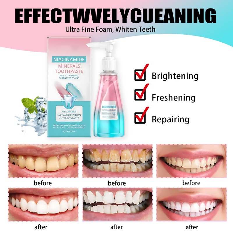 - 【Sanfte Formel】Niacinamide whitening toothpaste wurde speziell für empfindliche zähne entwickelt. Seine sanfte formel verhindert wirksam reizungen und sorgt dafür, dass flecken entfernt werden, ohne zähne oder zahnfleisch zu belasten. Auch menschen mit empfindlichen zähnen können es bedenkenlos verwenden und ein angenehmes reinigungserlebnis genießen.Niacinamid whitening zahnpasta macht ihre mundpflege schonender.