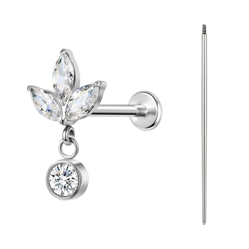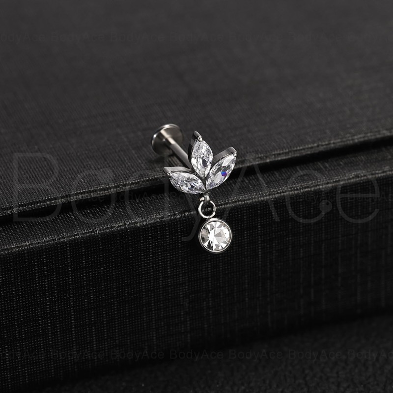 BodyAce F136 Titanium Body Piercing Studs, 16G Flat Back Cartilage Earring Studs with Piercing Taper, Internally Threaded Labret Lip Ring Conch Tragus Stud [Three Horse Eye Hanging Round Zircon]