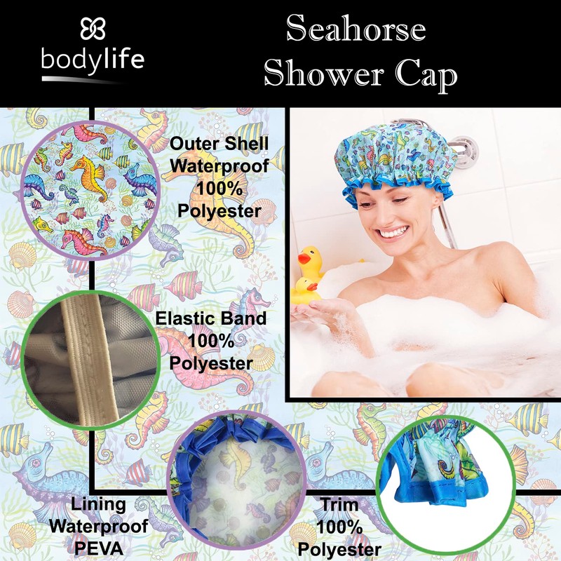 Bodylife Shower Cap Reusable Bath Cap Double Layered Waterproof Seahorse 27cm