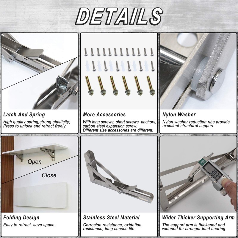 - Space Saving:The hinges lock at 90 degrees.The spring mechanism for the hinge is easy to access and it opens and closes smoothly. Bracket with hinge function in one unit Automatically locks when flap is in open position and press lever to release the lock.It is a good choice to use in limited space.