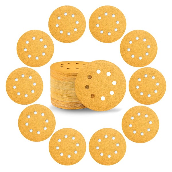 Boereu 5 Inch 8 Hole Sanding Discs Hook and Loop,50pcs Gold Round Hook and Loop Sandpaper for Random Orbital Sander 220 Grit