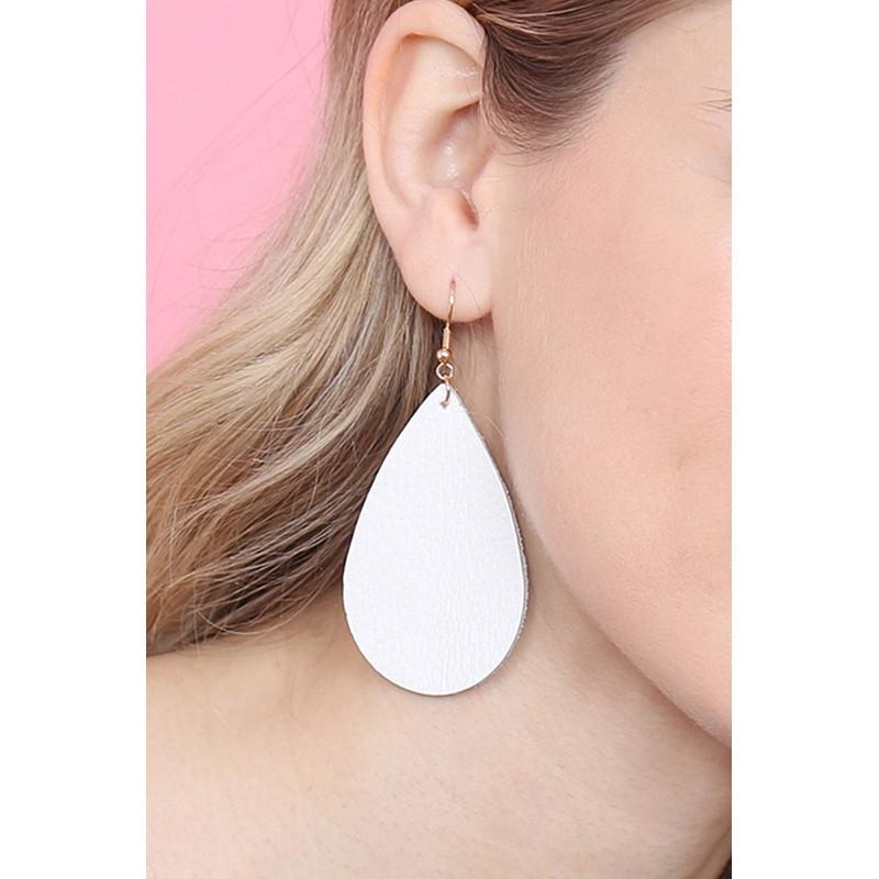 Bohemian Lightweight Genuine Real Leather Geometric Drop Statement Earrings - Petal Leaf, Triple Feather, Teardrop Dangles, Scallop Disc Hoop (Teardrop - White)