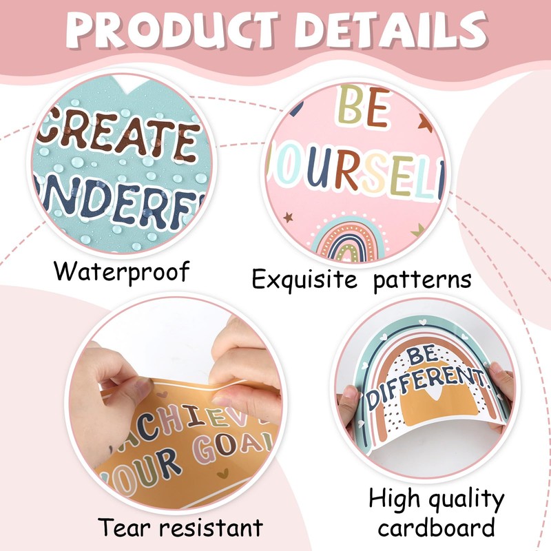 - Package includes: The boho positive affirmations bulletin board set includes 10 “Believe That You Can” letter title, 14 inspirational quotes posters, 15 boho bulletin board cutouts, 14 boho rainbow bulletin board borders, and 6 sheets of adhesive dots. Brighten up your classroom with this motivational bulletin board, creating a vibrant, welcoming, and motivating learning environment.