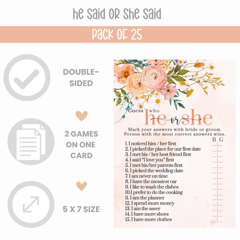 Boho Bridal Shower Games Bundle - He Said or She Said & Who Knows the Bride Best - 25 Double-Sided Cards with Floral Design for Engagement, Rehearsal Dinner Activities