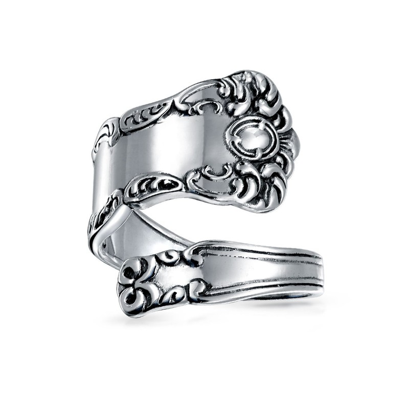 - Evoke the 1970s with this adjustable spoon ring. Made of sterling silver, this swirling cutlery themed band is 14mm wide and oxidized for an antique look, making it a great gift.