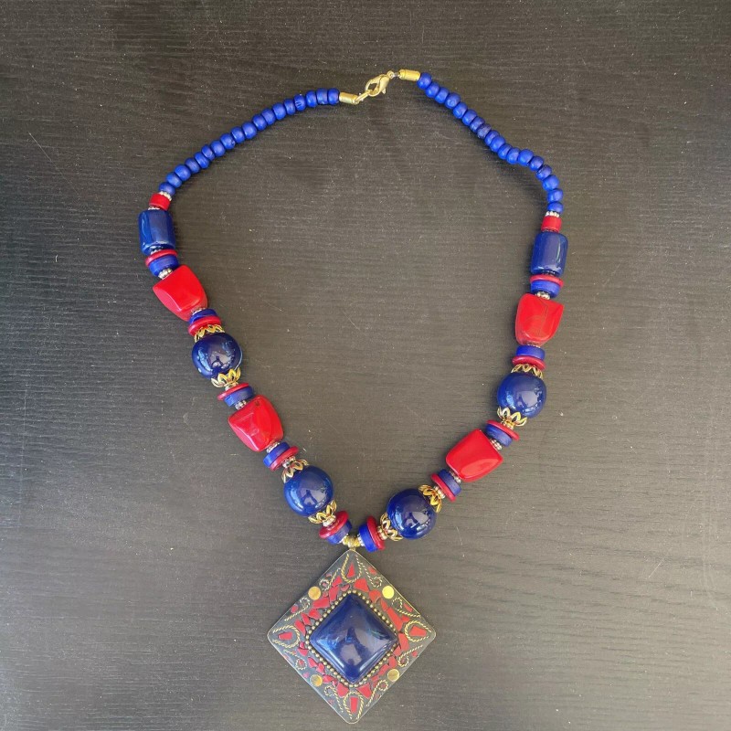 Boho HANDMADE NECKLACE INDIA ETHNIC TRIBAL BOHO BLUE ANND RED BRASS BEADS
