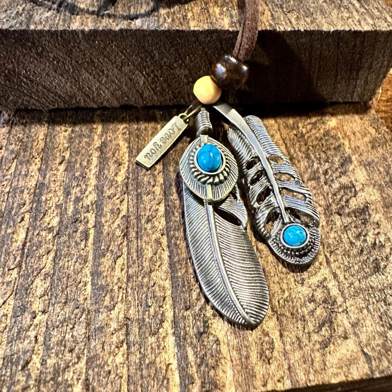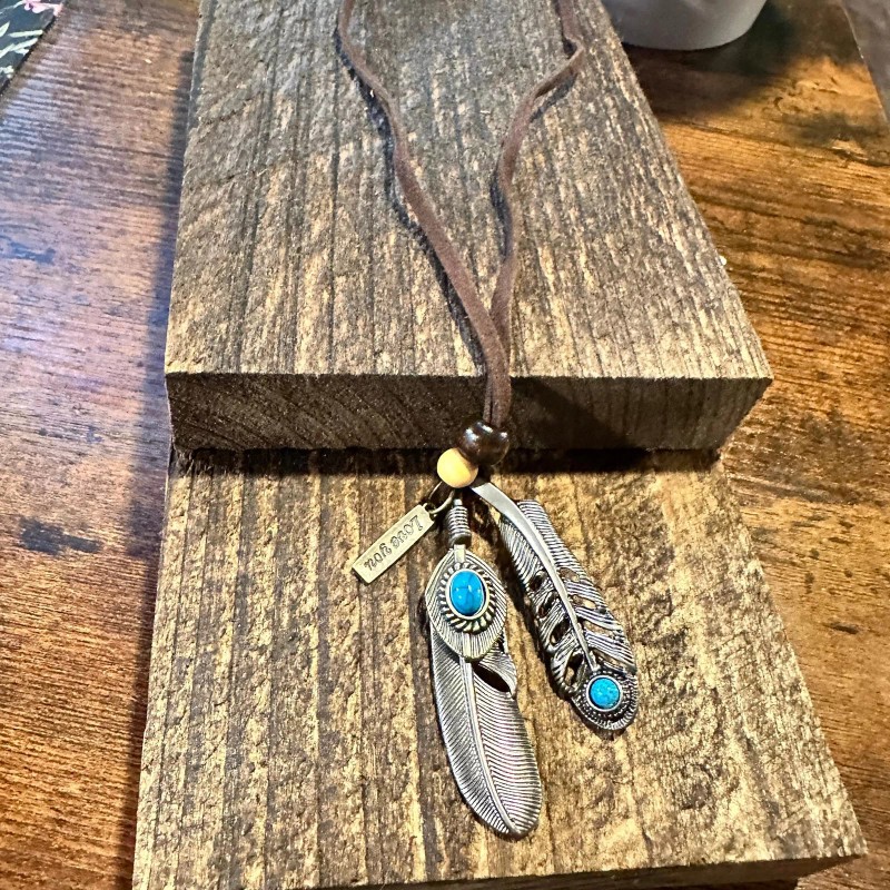 Southwest-Inspired Turquoise Feather Pendant Necklace on Brown Leather Cord, Gif