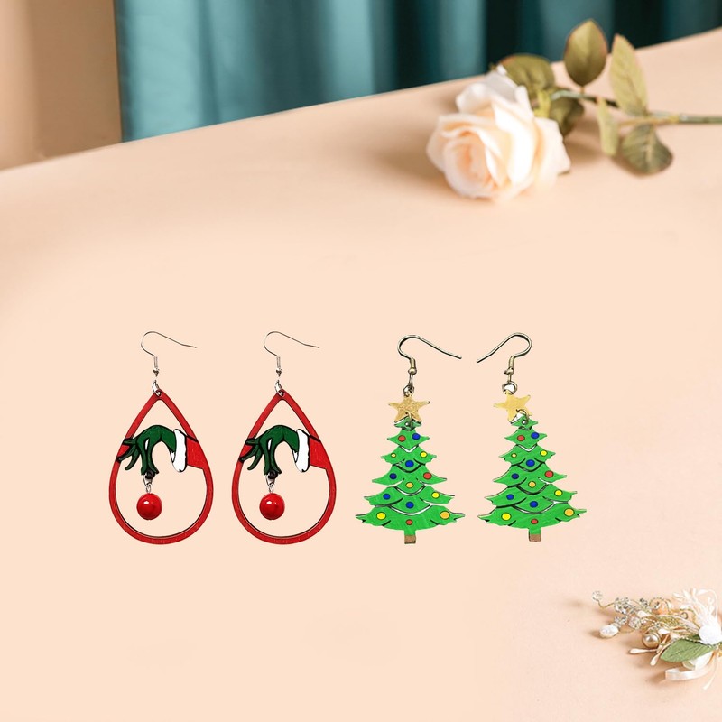 Bohue 2 Pairs Christmas Grinch Wooden Earrings Christmas Tree Earrings Cute Grinch Earring Christmas Xmas New Year Party Earrings for Women Girls