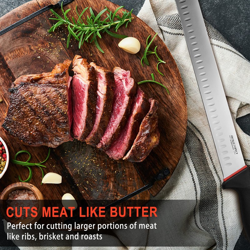 • BOLEXINO SLICING KNIFE: This slicer has a core of Japanese high quality steel, which means this blade will remain extremely sharp through many slices of protein before needing a touch-up. And the comfortable TPE handle which is good durability, smooth touch and comfortable grip.