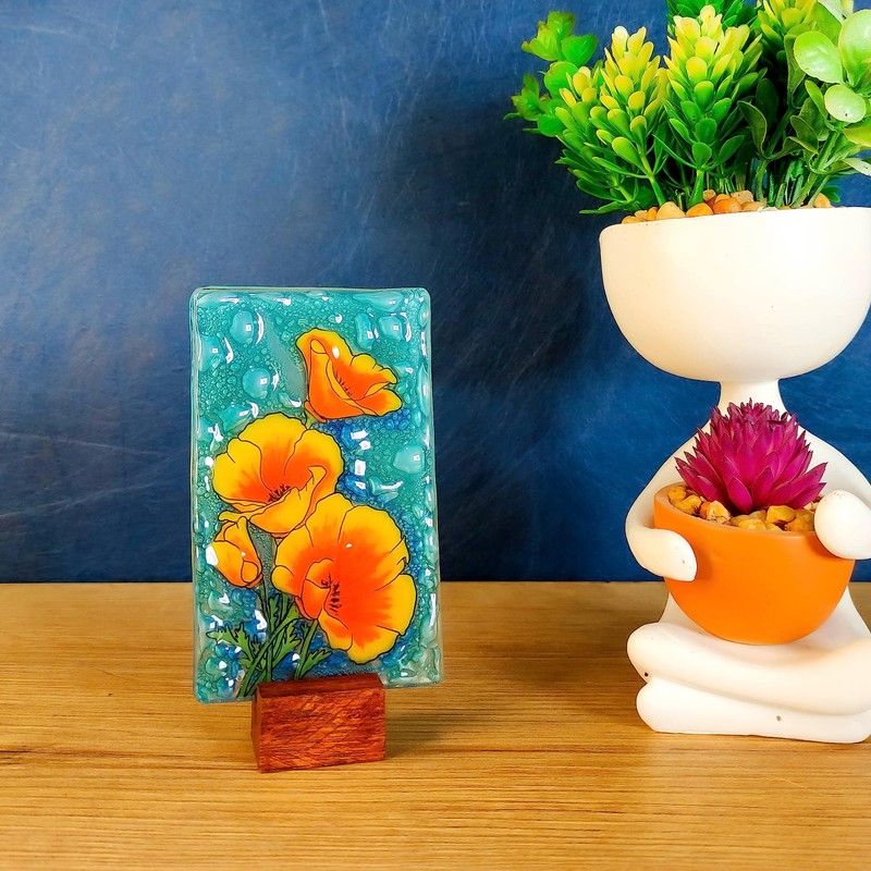 This is a Fused glass art with a California Poppy Ornament Desk with wood stand that you can place in your Desk, Office or Shelf around your House.