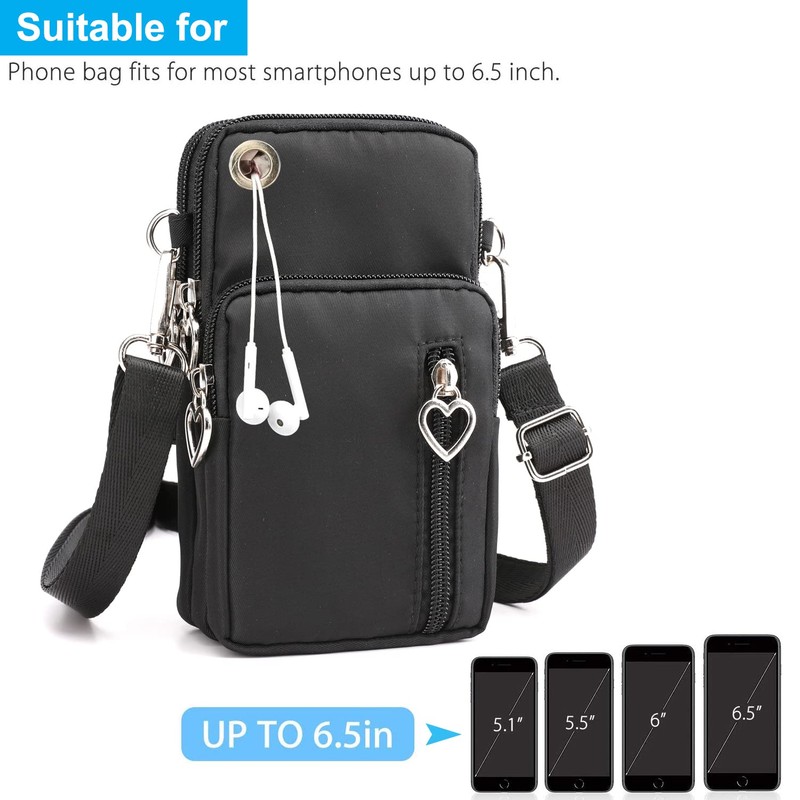 Bolsillo para Celular, MCSWSEE Bolso Cartera de Hombro Cruzado Negro con Entrada para Auriculares, Ajustable Bolso Bandolera de 3 Capas para Teléfonos Móviles 7 Pulgadas Menos, Tarjetas de Crédito