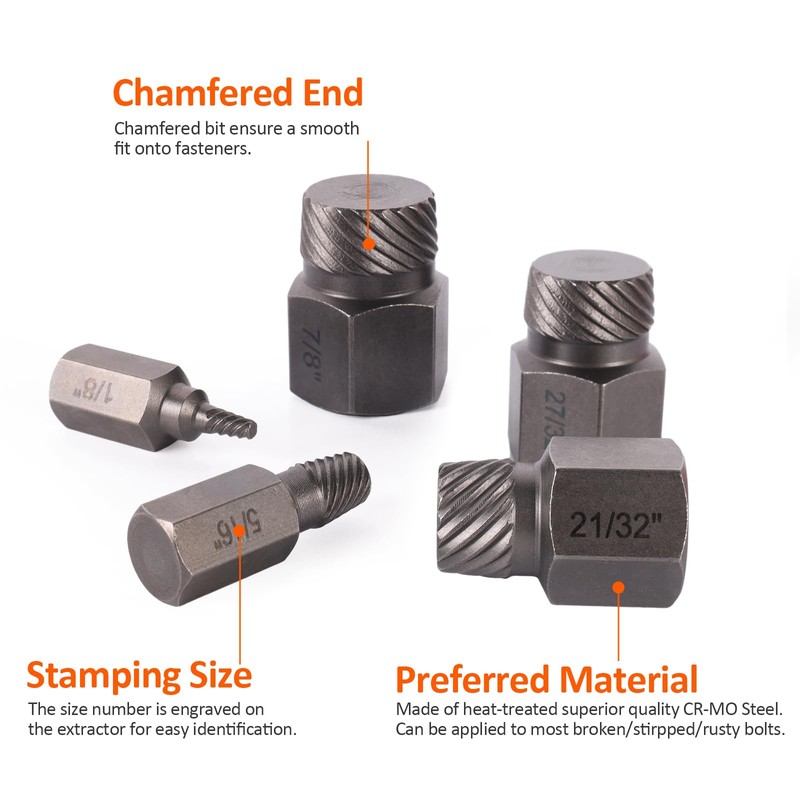• Easy Operability: The Extractor Set are suitable for both power tools and hand tools,high density spiral design helps faster removing broken screws, bolts, nuts, studs, fittings, threaded pipes and pins.