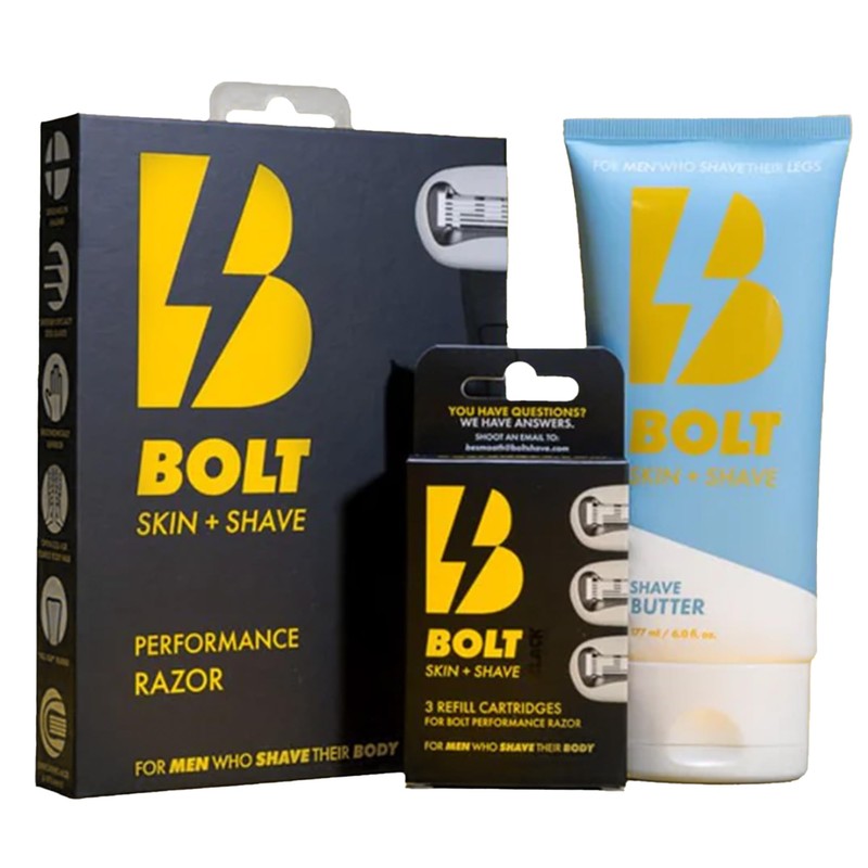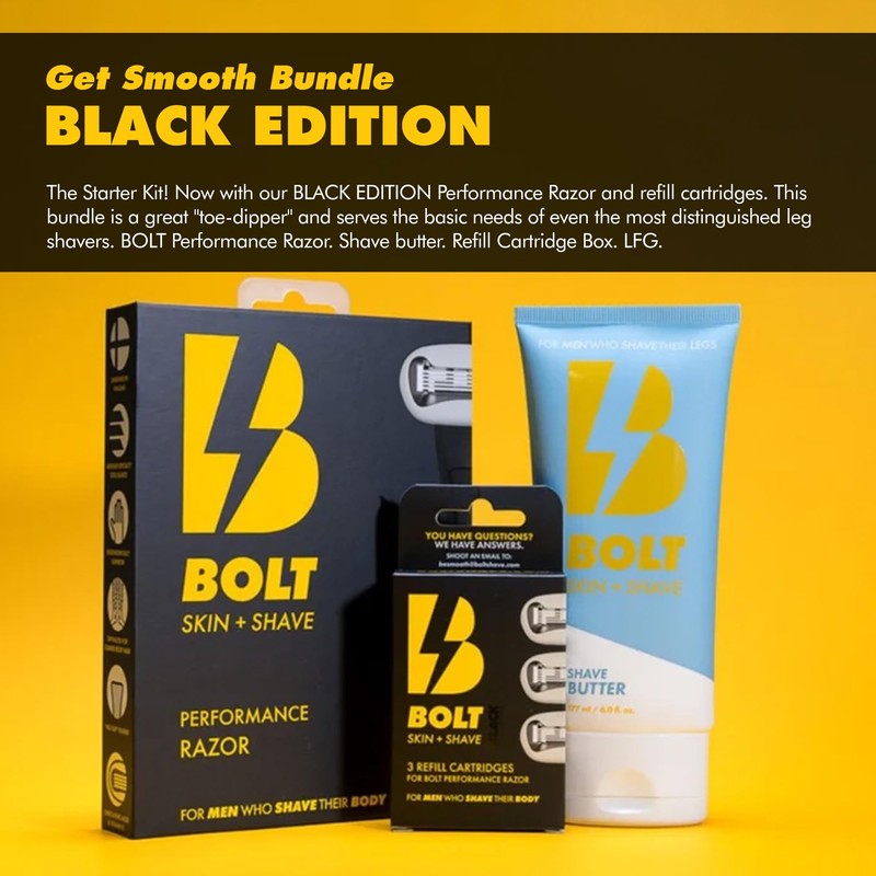 BOLT Skin + Shave - Starter Kit Black Edition - Performance Razor, Shave Butter & 3 Refill Cartridges - Smooth Shave for Body & Legs