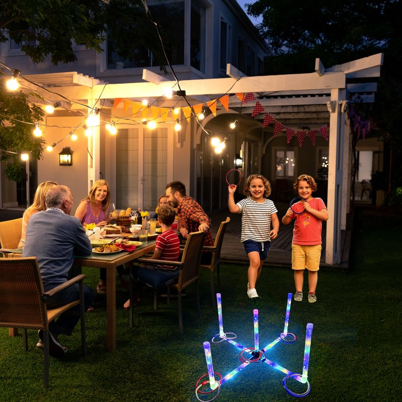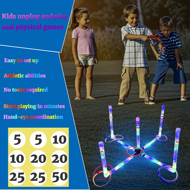 - Ring Toss Game: BomSaluka upgraded LED Ring Toss Game features pre-installed light wires, after being fully charged, turn on the switch it glow at night. Great carnival games, perfect for yard, party, beach,outdoor games.