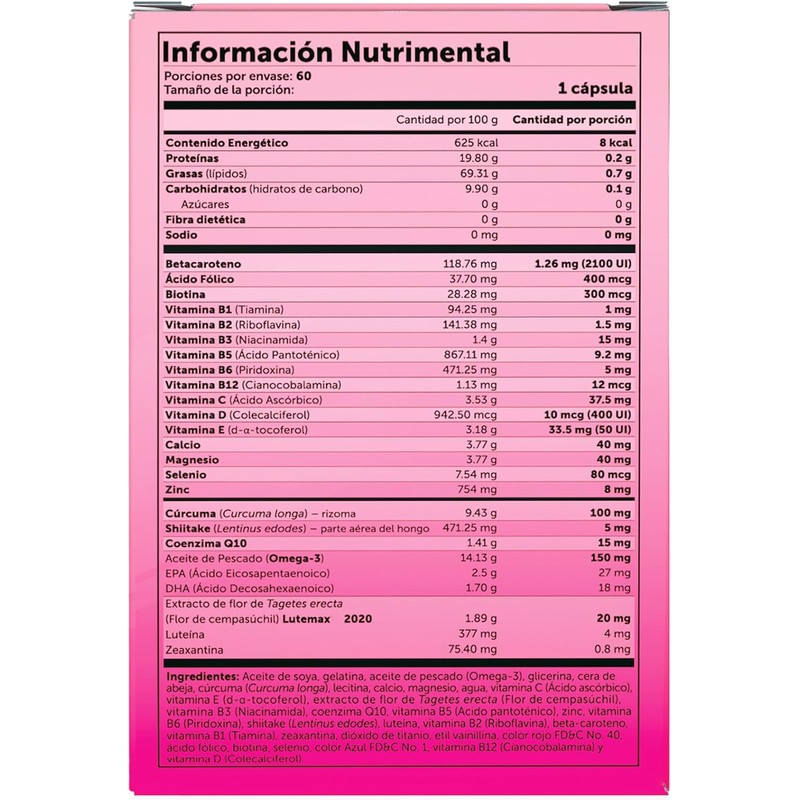 Ingredientes especiales | Aceite de soya, gelatina, glicerina, fruto en polvo de guaraná (Paullinia cupana), uva (Vitis vinifera), agua, lecitina, vitamina E (d-a-tocoferol), coenzima Q10, cera de abeja, L-arginina, L-lisina, zinc, licopeno, vitamina B6 (Piridoxina), vitamina A (Palmitato de retinol), dioxido de titanio, color Azul FD&C No. 1, etil vainillina, color rojo FD&C No. 40, seleio, vitamina B1 (Tiamina), biotina, vitamina B12 (Cianocobalamina), vitamina D (Colecalciferol).Aceite de soya, gelatina, glicerina, fruto en polvo de guaraná (Paullinia cupana), uva (Vitis vinifera), agua, lecitina, vitamina E (d-a-tocoferol), coenzima Q10, cera de abeja, L-… Ver más |