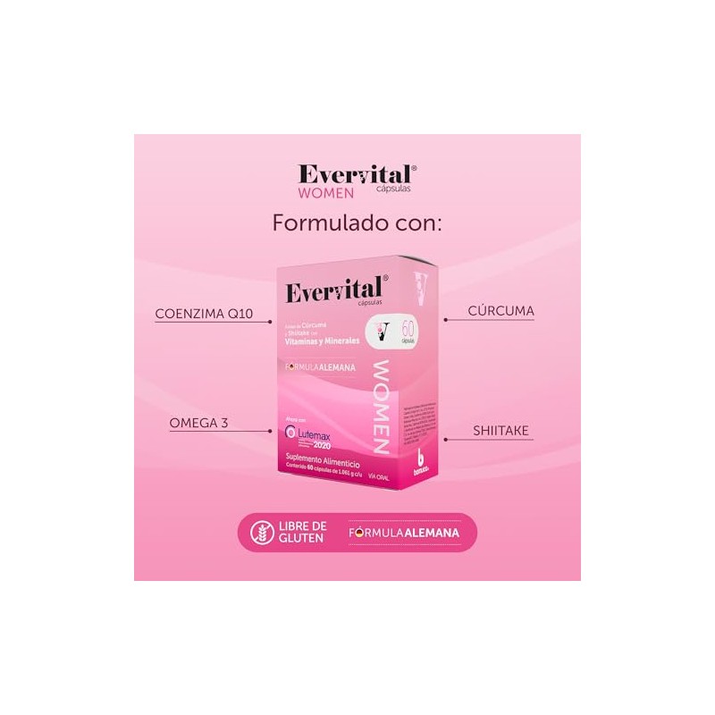BOMUCA - Evervital Women 60 Cpsulas Suplemento Alimenticio A base de Crcuma Shiitake Lutemax 2020 Vitaminas y Minerales