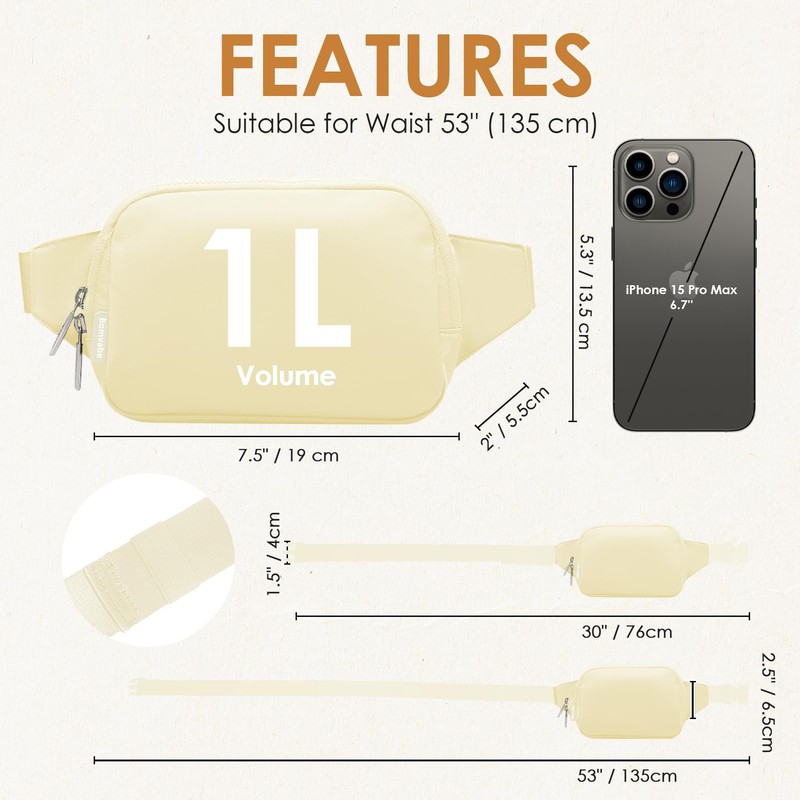 - COMPACT SIZE WITH AMPLE STORAGE: Bomvabe Mini Belt Bag measures 7.5" x 2" x 5.3" (19 x 5.5 x 13.5 cm) and has a 1L capacity, providing roomy space for your essentials such as cellphone, wallet, keys, power bank, and cosmetics while maintaining a compact and lightweight design