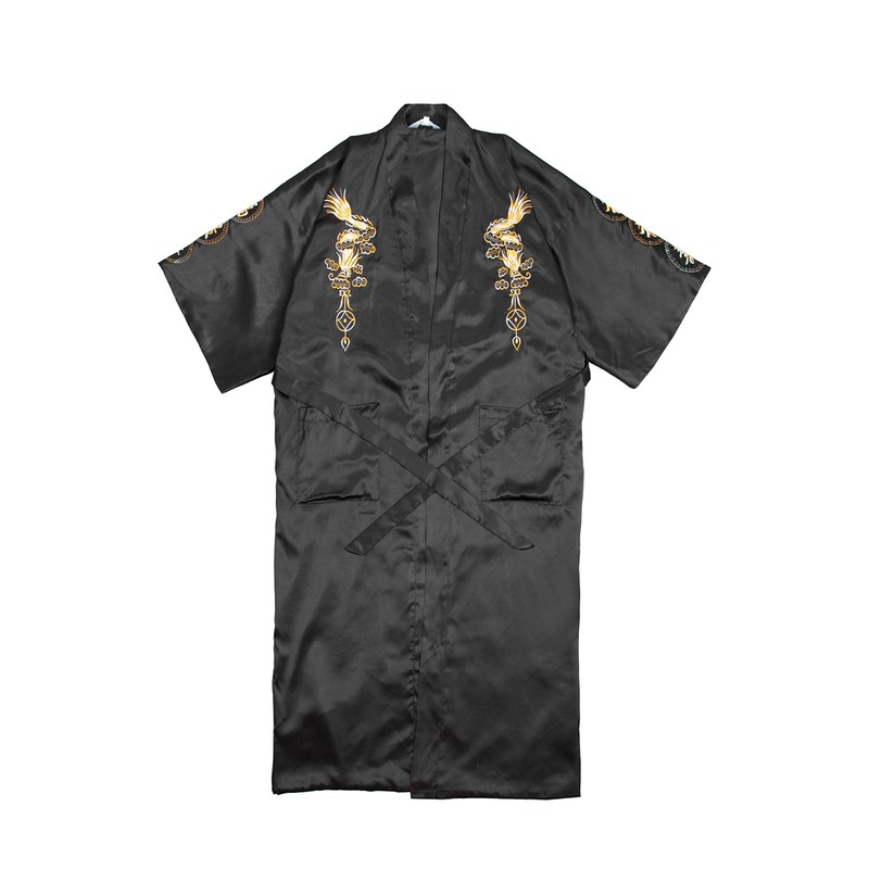 Bon amixyl Men’s Dressing Gown Bathrobe Satin Silk Bath Robe Kimono Gown Dragon Embroidery Yukata Hakma Vintage Black