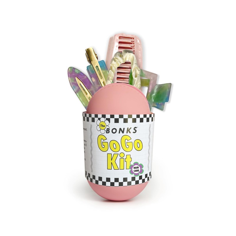 - STAY STYLISH ANYWHERE: Whether you're at work, school, the gym, or on the go, the BONKS GoGo Hair Care Kit keeps your hair looking polished and effortless. Includes a curated set of everyday essentials: mini claw clip, two seamless hair pins, silky ivory hair tie, and a foldable pink wheatgrass comb.