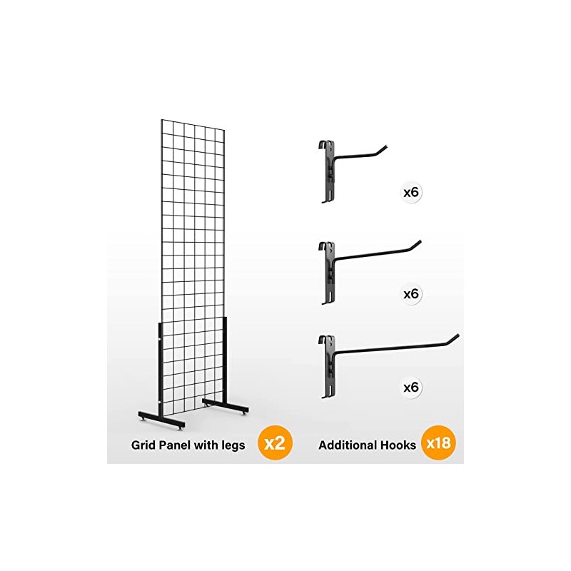 Bonnlo 6' x 2' Wire Grid Panel Tower with T-Base Floorstanding, Thicker 5mm Wire, 180 LBS Weight Capacity Grid Wall Display Rack with Hooks 4", 6" and 8", 2-Pack Black