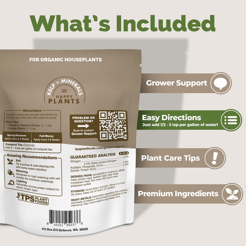 - Enriched with Kelp and trace elements to support overall plant vigor and resilience to environmental stressors.