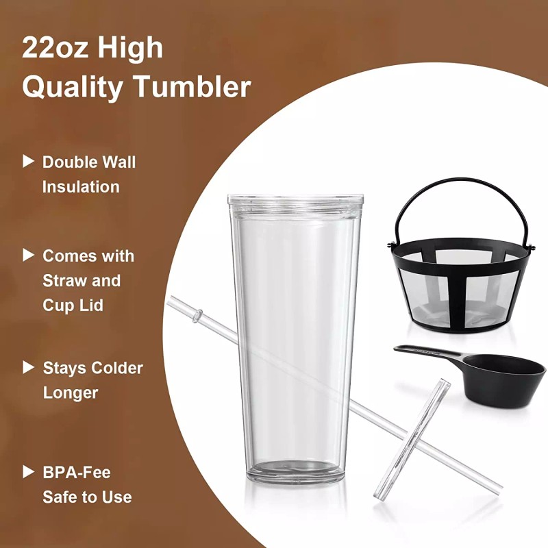 - 【What you get】 Includes an iced coffee machine, a reusable coffee filter, a scoop, and a 22oz. coffee tumbler with lid and straw, so you can easily take your coffee on the go. Reusable coffee filter and brew basket are dishwasher safe. All of these are BPA free.