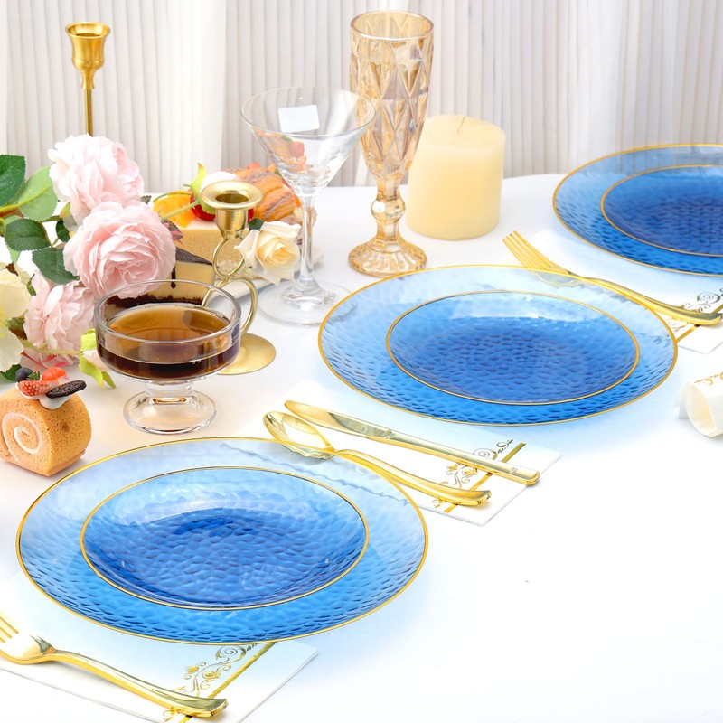BONSINY Blue Plastic Dinnnerware Set for 25 Guests - Clear Blue Plastic Plates Disposable with Gold Trim - Fancy Disposable Plates for Party Wedding Easter Graduation Patriotic Party