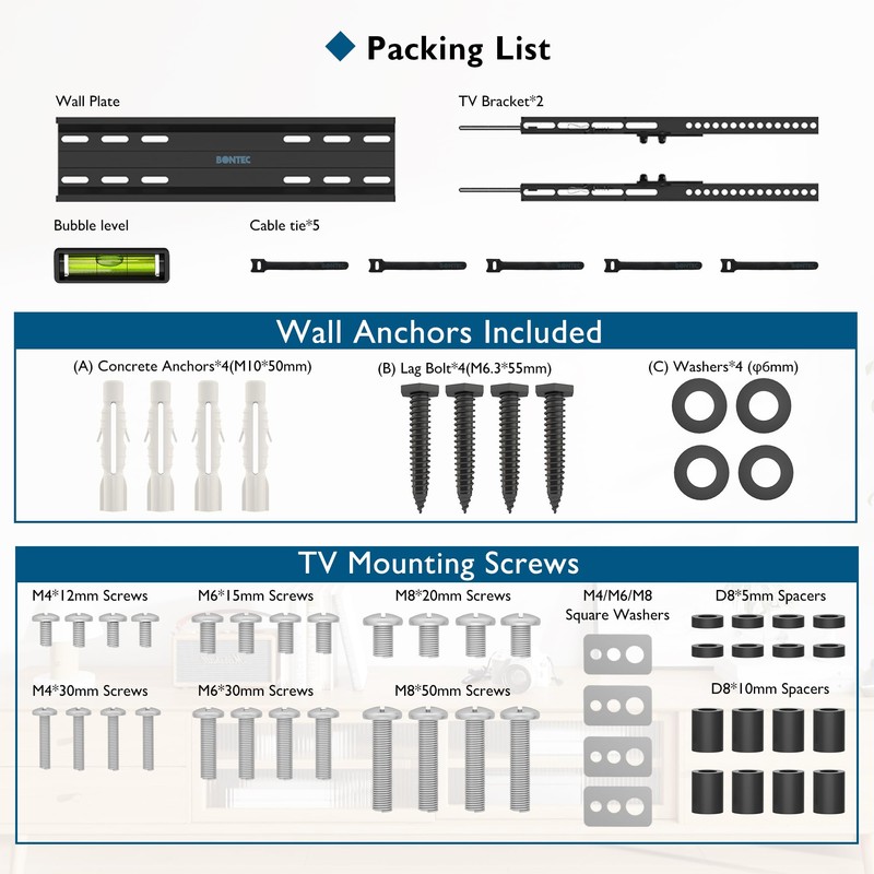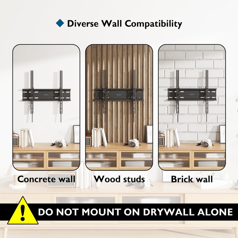 • EASY INSTALLATION: This wall mount TV includes all necessary mounting hardware, a bubble level, and clear instructions for quick and hassle-free installation on concrete, wood studs, or brick walls. Note: Do not mount on drywall alone