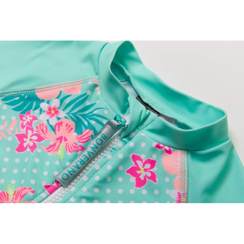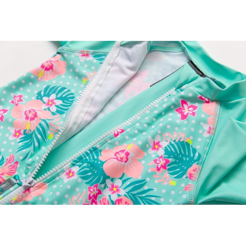 BONVERANO Little Girls' Swimming Costume One Piece Extra Long Zip with Swimming Cap UV Protection 50+, Green (green flower)