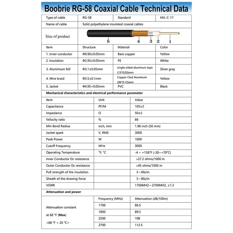 - √ MATERIAL The outer shell of RG58 coaxial cable is extruded and abrasion resistant PVC (PVC), to ensure normal indoor and outdoor use in extreme weather conditions as well as protection against wind, sand, moisture and corrosion.
