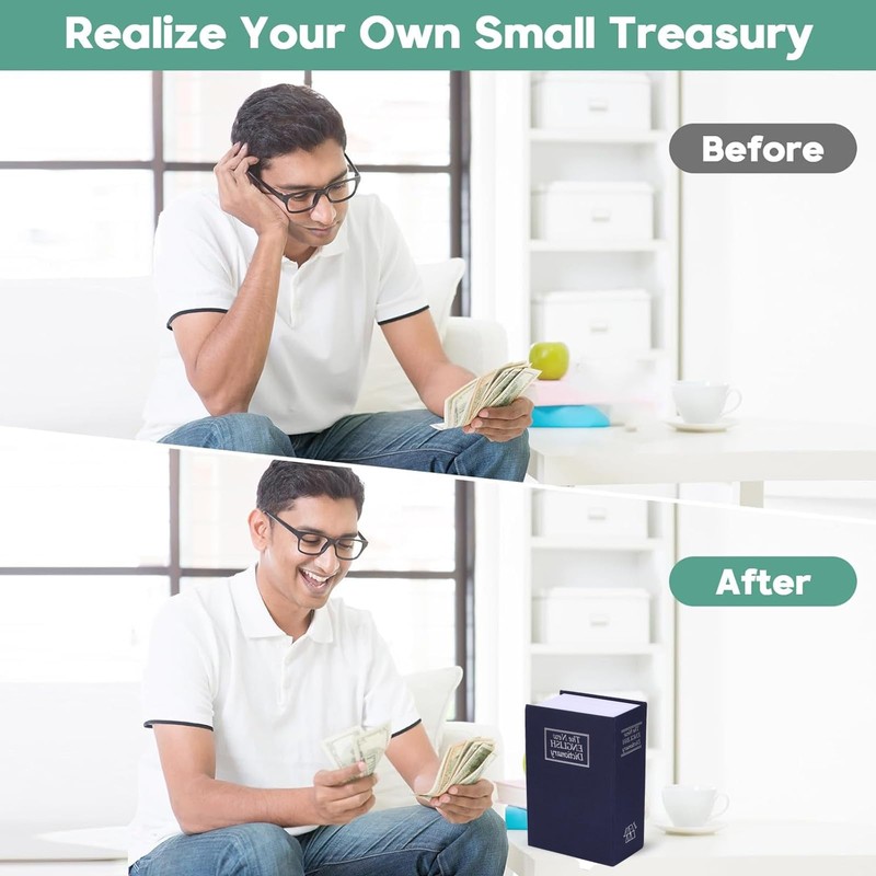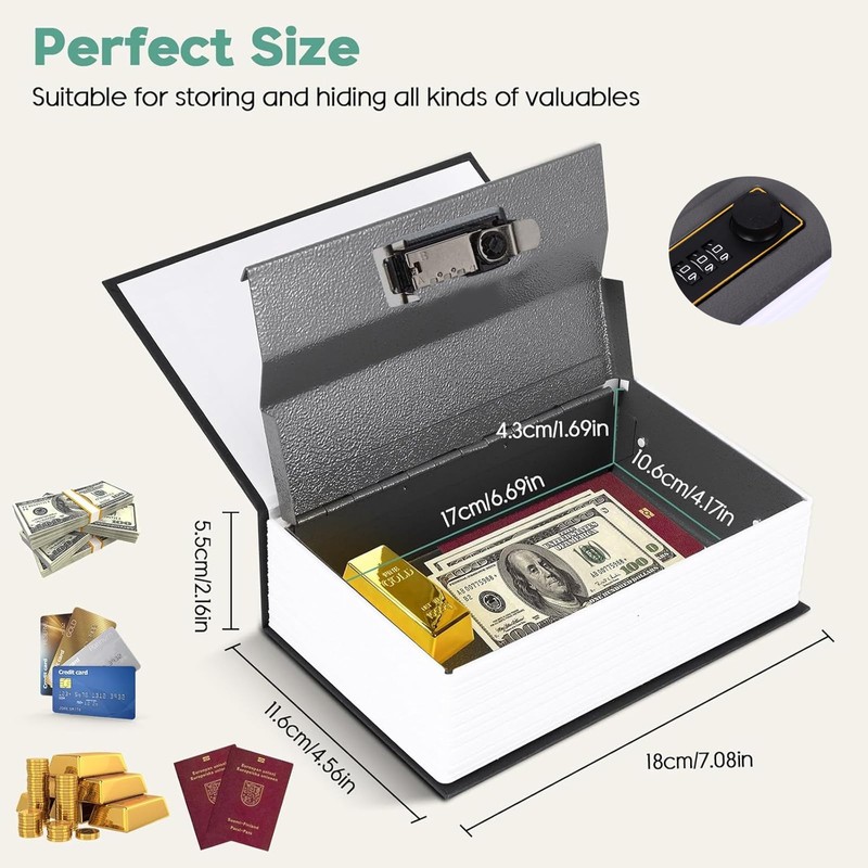 • 💵【LARGE CAPACITY SIZE, PERFECT STORAGE】The book safe lock box measures 7.1 x 4.7 x 2.3 inches, which does not take up too much space, but provides enough storage space, suitable for valuables such as jewelry, important documents, cash, etc. Even important documents such as credit cards and passports can be properly kept, providing you with multiple security guarantees.