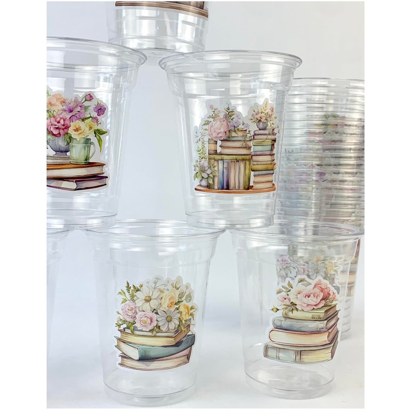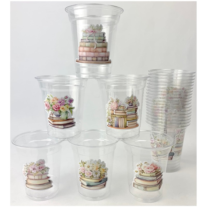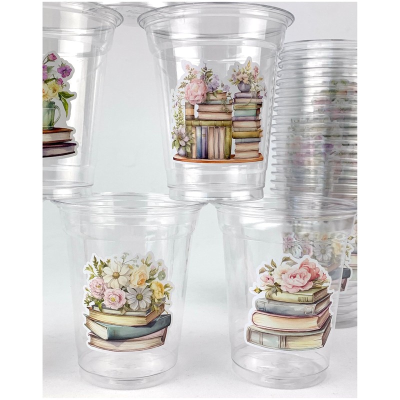 - PARTY PACK: Set of 24 clear plastic disposable cups with charming book stack and floral designs, perfect for literary-themed celebrations and gatherings