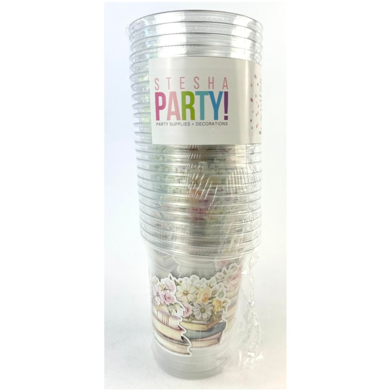 Book-Themed Party Cups, 12 oz Clear Plastic, 24 Count, Floral Book Stack Design